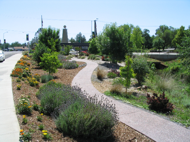 Three distinct spaces currently comprise the project’s gardens on Shasta Dam Boulevard. Running east to west, they are the Clock Tower Garden, a formal parterre of colorful and textural hedged shrubs outlining a narrow portion of the greenbelt median, complete with a Victorian style Clock Tower. To the west of the Clock Tower Garden, the Veterans Memorial sits across a break in the median. The garden project members have recently revived the plantings in and around the Veterans Memorial itself, which serves as gateway of sorts into the project’s largest and most ambitious garden: the Memorial Garden. Covering nearly two acres, this garden is largely made up of drought tolerant perennials, trees and shrubs. Its paths are partially lined with memorial bricks – with room for more – and each large tree and bench along the curving pathways create additional memorial tributes for family and friends of the town’s citizens. On its easternmost side, this garden includes a demonstration memorial rose garden with plants primarily donated by Jackson & Perkins rose growers. On its western-most side, across a small creek and wetland swath dividing the space, is a native plant garden, with plants chosen specifically for their usefulness in Native American tradition. Overseen by member Gennie Seely, an educator of Wiyot descent, the native garden includes prolifically blooming California fuchshia, ceanothus, sedges and cattails. Photo: Restful benches and arching carex in the Shasta Lake Garden Project’s Shasta Dam Boulevard Gardens.
