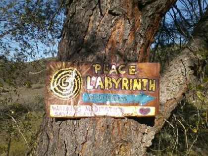 A sign on a tree near the trail identified the place at the Peace Labyrinth, and it welcomed people to come walk, meditate, pray and leave a rock.