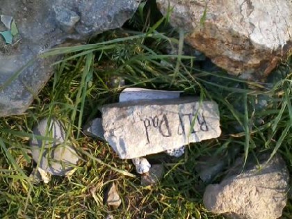 We walked down the incline, went to the center of the Peace Labyrinth and started walking, first in tight little circles, but eventually the paths widened out. Mostly, the path was lined with regular rocks, but it was also dotted liberally with special rocks with written messages, and decorated with trinkets and feathers and glass beads and tiny toys. There were pieces of paper tucked under some rocks, private messages, no doubt, like the paper under a rock that had the words, “R.I.P. Dad”.