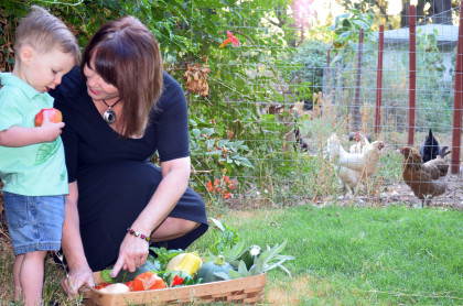 While you do that, I’ll share a photo taken just for this occasion by photographer Kat Domke, who happens to be my daughter-in-law, married to my son, Josh. They’re the parents of Austin, Noni Doni’s 22-month-old pride and joy. In this photo, Austin was telling me about the contents of my basket after I stopped by Kat and Josh’s house to raid their garden for the photo shoot.