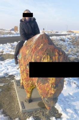 On the way out, the gang noticed a life-sized artistic statue of a buffalo. One member of the Barrow gang suggested that Bonnie climb on top for a photo opp.