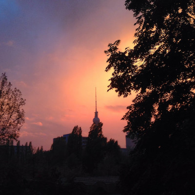 I’m at my friend’s house in Berlin right now, and the view from the kitchen table, where I am sitting right now, is of the Fernsehturm TV Tower in the distance and right across the street, a school gymnasium. At night grown-ups play basketball in there and they’re hilariously bad.