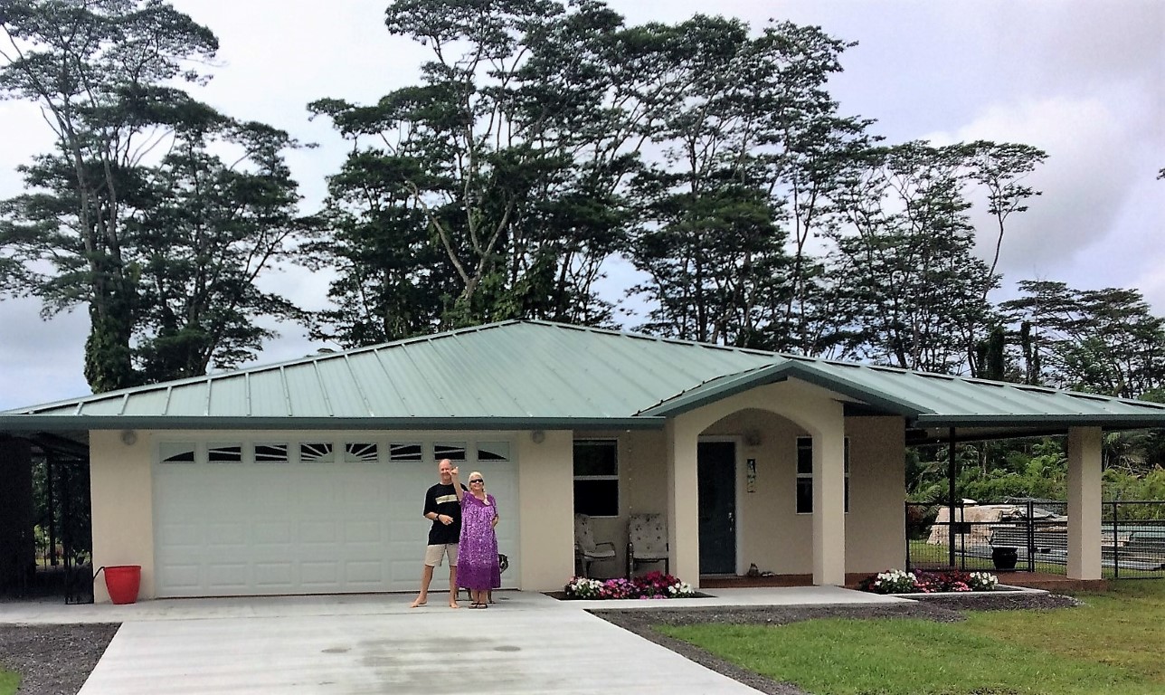 Annette and Kip pose in front of their Hawaiian home, before their neighborhood was destroyed by lava.