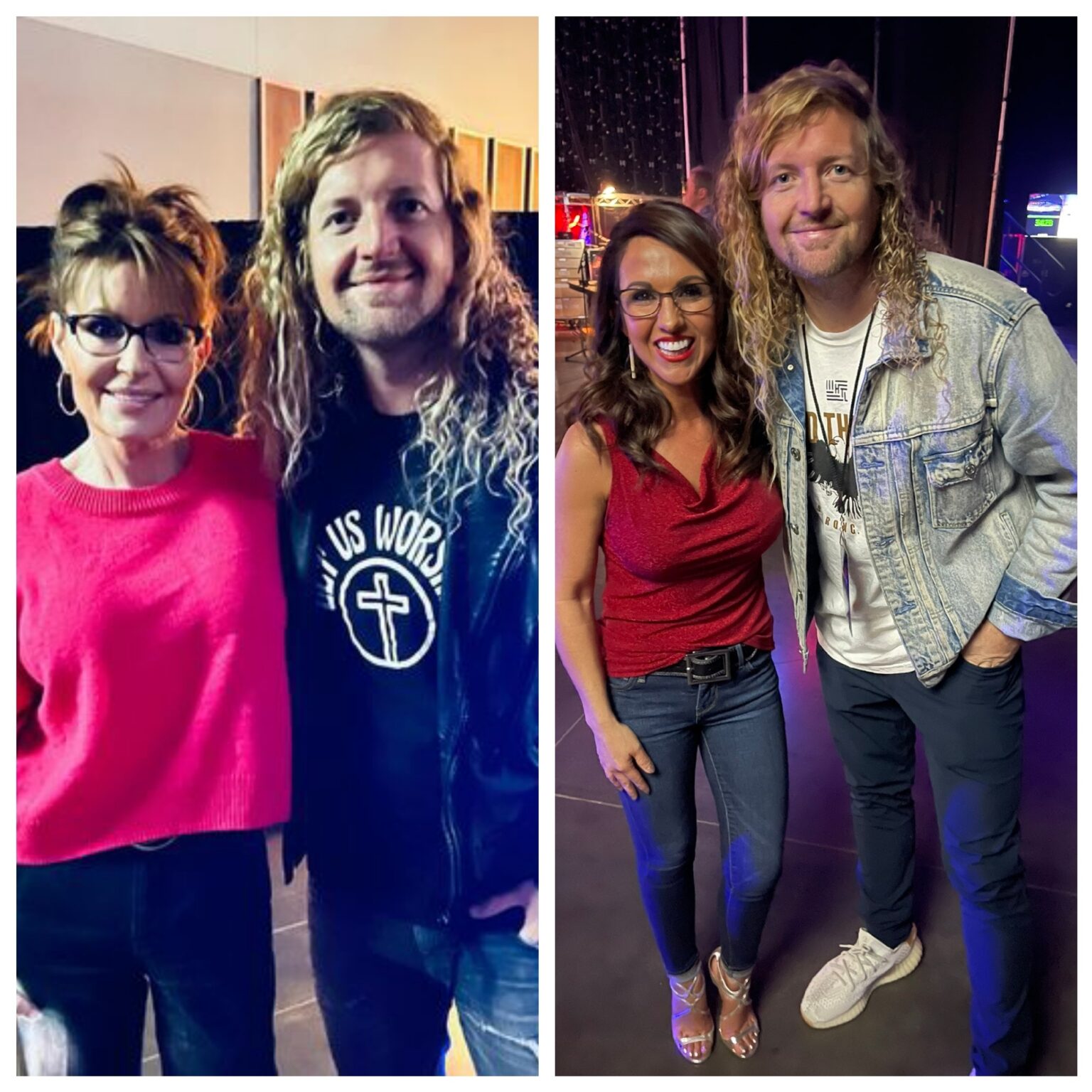 Sean Feucht poses for a photograph with Sarah Palin and Congresswoman Lauren Boebert at Americafest.