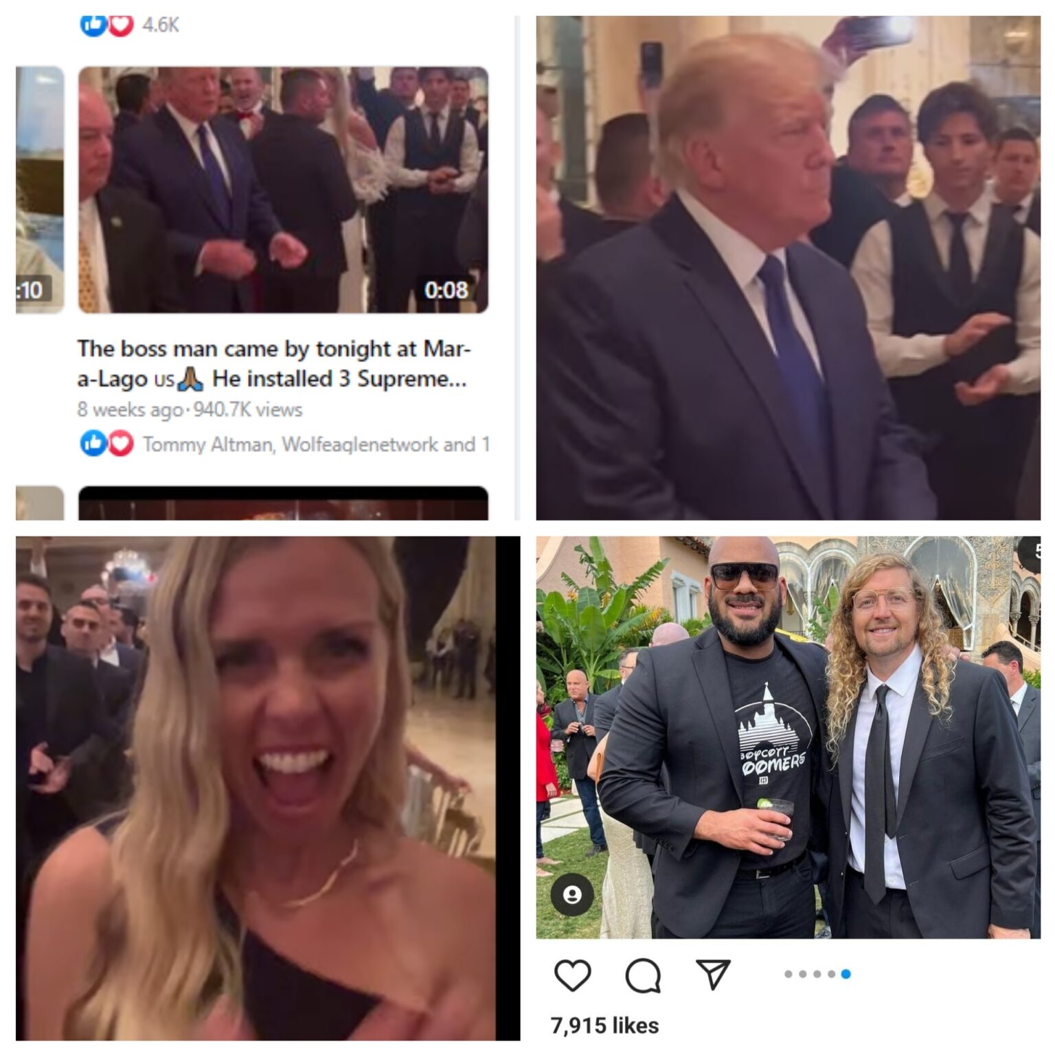 Video of 2000 Mules Mar-a-Lago premier party shared by Feucht on Facebook, screenshots of former President Trump and Katie Feucht (Sean’s wife) from the video, and photograph of Feucht and David Harris Jr. at the event shared on Instagram by Harris Jr (bottom right).