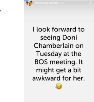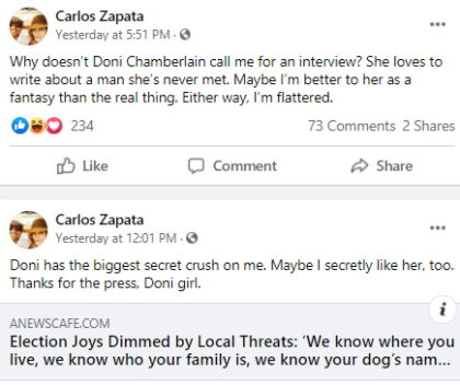 Recently, an outraged Zapata made a number of threatening, demeaning, profane calls to people’s homes, and in one case, to a person’s adult son’s workplace following a Facebook thread that was uncomplimentary to Zapata.