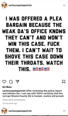 “The case was forwarded to the Shasta County District Attorney’s Office requesting a single charge of 422 PC — Terrorist Threats — on the suspect, Carlos Zapata,” Schueller said in an email.
