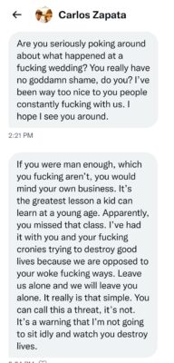 Yet other times Zapata makes threats and then claims they are not threats (but they are). Case in point is this recent message to A News Cafe reporter Shawn Schwaller that contained such obviously threatening words as, “I’ve been way too nice to you people constantly fucking with us. I hope to see you around,” and “You can call this a threat, it’s not. It’s a warning that I’m not going to sit idly and watch you destroy lives.”