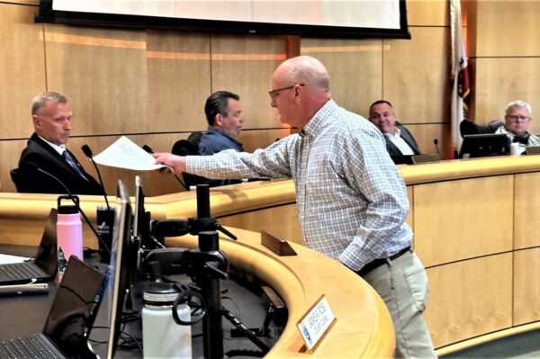 A smiling Dist. 4 Supervisor Chair Patrick Jones looks on as Tim Hill serves Dist. 1 Supervisor Kevin Crye with intent-to-recall papers. Photo by Mike Chapman for A News Cafe.