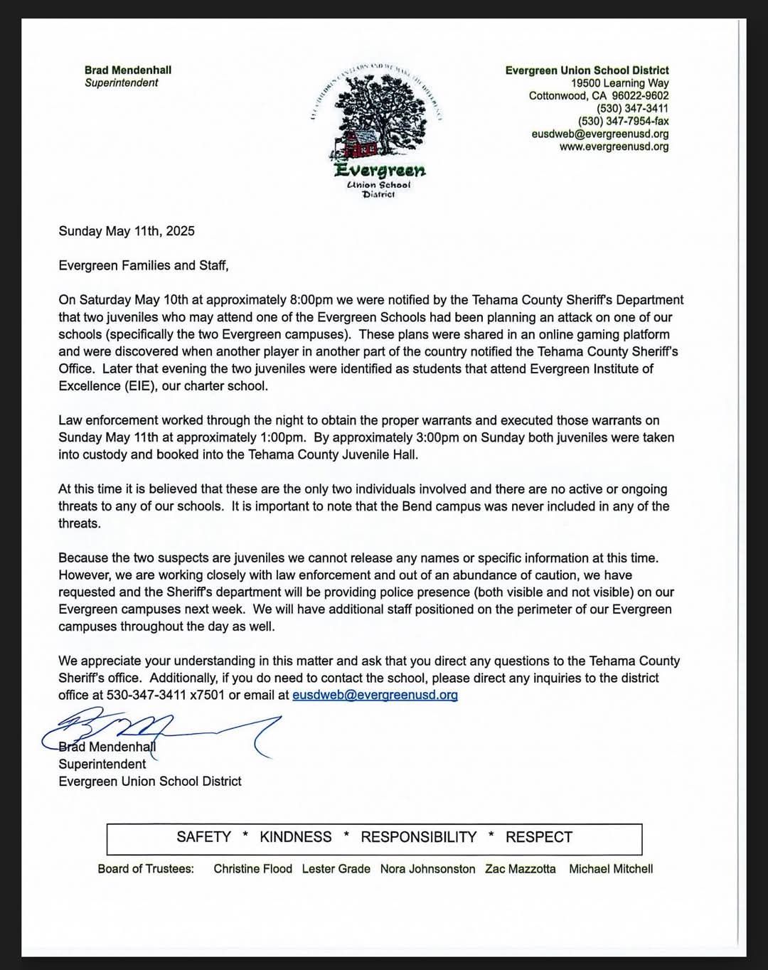 The Tehama County Sheriff’s Office would like to thank the school administration for their assistance and involvement in this investigation, the tireless hard work of the deputies and investigators to expeditiously mitigate this threat and as a community we want to send out a heartfelt thank you to the reporting party who heard something and said something, which could have saved a number of lives.