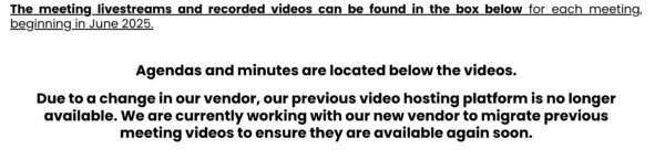 “Due to the change in our vendor, our previous video hosting is no longer available,” the clerk responded. “We are currently looking into options, but currently there is no way to post our older videos directly on the county website.”