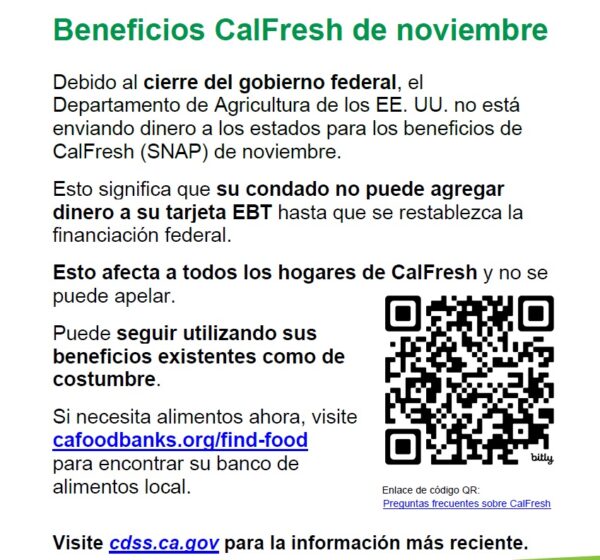 November benefits to CalFresh clients will be delayed due to the government shutdown, the California Department of Social Services (CDSS) webpage read this week. Learn more on CDSS’ CalFresh Frequently Asked Questions webpage. CalFresh is California’s name for the federal Supplemental Nutrition Assistance Program (SNAP). It provides food benefits to eligible individuals with low incomes.