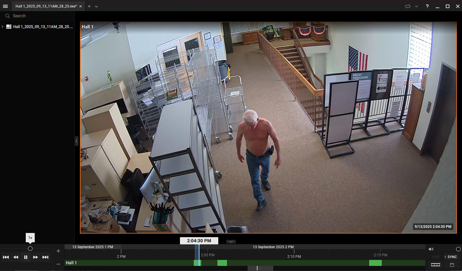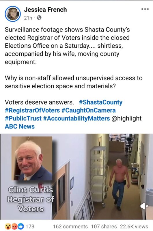 Surveillance video captured inside the closed Shasta County Elections Office shows a shirtless Registrar of Voters, Clint Curtis, moving county equipment alongside his wife, Jody Curtis, who is not a county employee. An edited clip of the Sat., Sept. 13, 2025, footage was released on Oct. 25, 2025, and soon went viral across several social media platforms. The video, which has been viewed more than 20,000 times, has prompted questions about employees’ after-hours access to a secure elections facility, as well as questions whether non-staff are allowed inside restricted areas, and the risk for potential liability if a non-employee is injured while handling county property.
