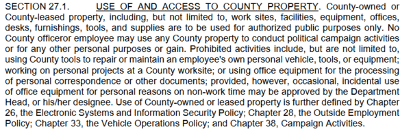 According to Shasta County’s personnel rules, county property and facilities “are to be used for authorized public purposes only,” not for personal purposes or gain, and reference related policies governing equipment and facility use (vehicles, outside employment, etc.). The rules don’t directly address non-employees moving county equipment, but the rules imply that use is restricted to authorized purposes and subject to department oversight.