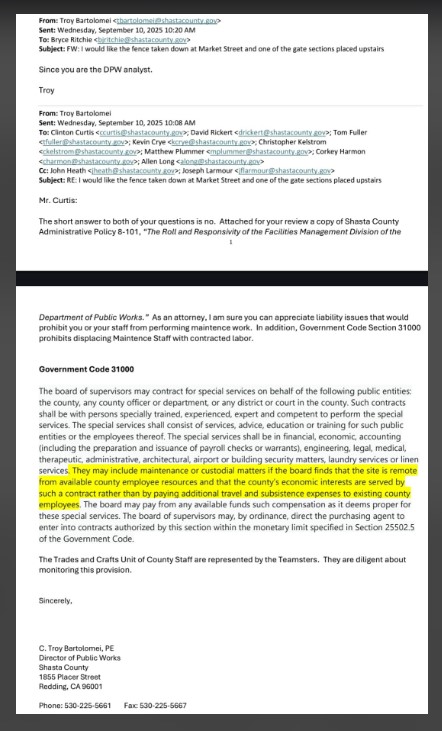 Although county policy regarding weekend access, non-employee presence, and heavy-equipment moves has not been publicly explained, and is currently unclear, in an email from Public Works Director Troy Bartlolomei, Curtis’ previous request to bring tools to work to dismantle the Elections Department metal fencing, Bartlolomei explained why such a project was prohibited, and must be completed by the appropriate county staff.