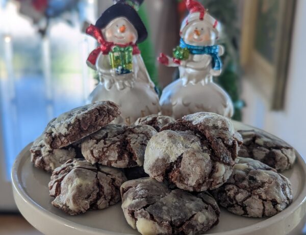 Mr. Snowman and Mrs. Snowman watch over the Chocolate Crackle cookies.
