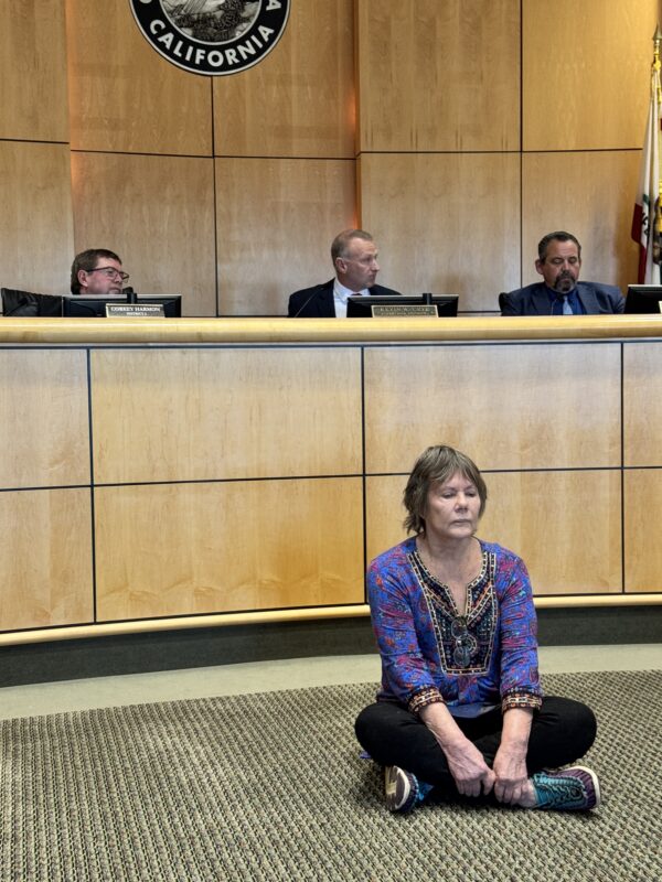 Jenny O’Connell-Nowain engages in an act of peaceful civil disobedience during a November, 2024 Shasta County Board of Supervisors meeting. Photo by Doni Chamberlain for A News Cafe.