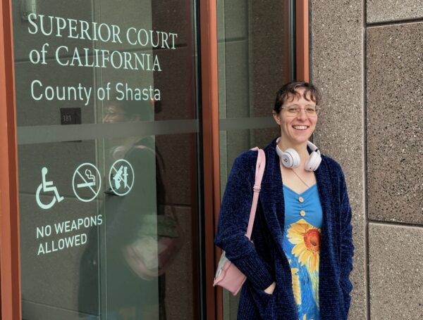 Jenny O’Connell-Nowain stands outside Shasta County Superior Court on Thursday, Dec. 18, 2025, after a jury found her guilty of disrupting a Board of Supervisors meeting last year. The jury deadlocked on a second count and it was dismissed. Photo by Mike Chapman/A News Cafe.