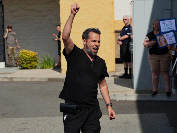 Protest organizer Benjamin Nowain raises his fist during a demonstration on May 5, 2025, outside the Ninja Coalition HQ business that’s owned by Shasta County Supervisor Kevin Crye at the Mt. Shasta Mall in Redding. Local demonstrators showed their support for Joanna Francescut, the former assistant registrar of voters, after the Board of Supervisors chose Clint Curtis to serve as county elections chief. Photo by Mike Chapman for A News Cafe.