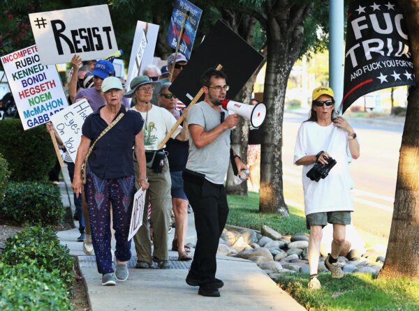 Benjamin Nowain, center with bullhorn, leads a sidewalk march along Cypress Avenue in Redding as part of the “Good Trouble Lives On” rally on July 17, 2025. Demonstrators protested throughout the country that day, saying they were outraged by the Trump administration’s attacks on human rights. Photo by Mike Chapman for A News Cafe.
