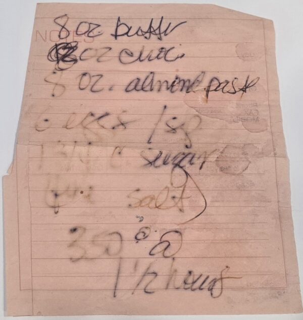It was so delicious that as were were leaving the restaurant I raved to Maddalena about the cake and asked how she made it. As she continued cooking (the open kitchen exposes diners to flames, sizzles, chef talk and all, which I LOVE) she quickly rattled off ingredients, quantities and instructions. I thanked her, raced to the car, grabbed a piece of paper from a memo pad (remember those?) and hurriedly scribbled down everything Maddalena had said.