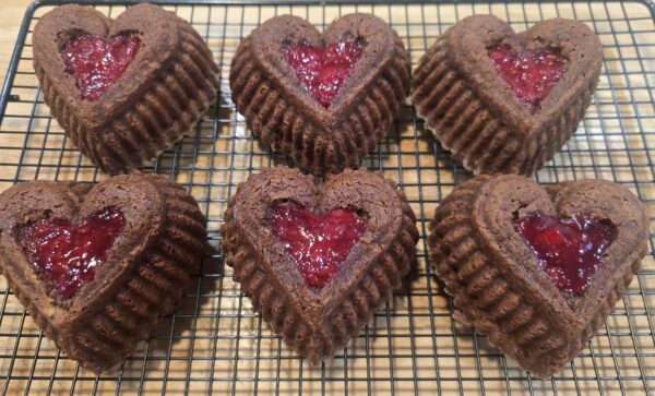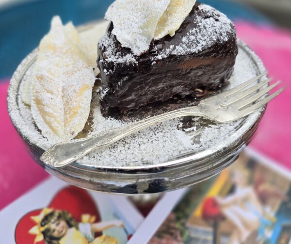 But today I’m talking about food, and more specifically the heart-shaped flowerless chocolate cakes I made for a recent Galentine’s Day gathering. No brag, but my flourless chocolate cake is near perfection just the way it is. It ought to be. It’s a recipe I first tasted at Cafe Maddalena in Dunsmuir many moons and at least one marriage ago. Maddalena served her flourless chocolate cake in an understated triangular slice, dusted with powdered sugar, topped with whipped cream.