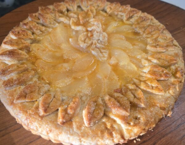 Doni’s simple pear tart:. Line a tart pan with pie crust, leaving a wide lip that hangs over. Beat about 8 ounces of room-temp almond paste with an egg, about 1/3 cup of cream, 1 teaspoon of vanilla, and powdered sugar to taste (about 1/2 cup). Pour mixture into the unbaked pie crust. Cover with canned sliced pears. (It’s a very Frenchy thing to do.) Fold over the overhanging pie dough and decorate the top as you wish. Brush with a beaten egg thinned with cream and a little sugar. Bake at 375 degrees on a rack low in the oven until it’s golden brown. Serve with vanilla ice cream.