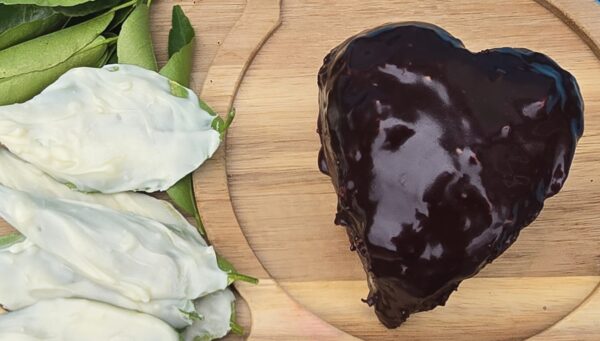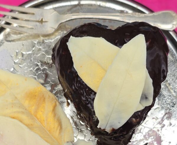 The shiny chocolate little cake (full disclosure, trimmed to look more heart-like than liver-like) awaits the application of the cosmetic white chocolate leaves.