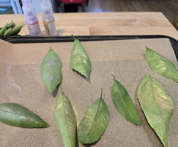 Not so fast, though, Doni. Hey, what about that edible Dollar Tree glitter dust spray? What if I first sprayed some on the leaves, and then spread the white chocolate over the glitter dust? Oh my gosh! That would be stunning.