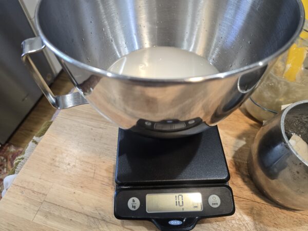 Place a mixing bowl on the food scale, and “tare” it to zero on the kg setting. (When you “tare” the scale you’re forcing it to ignore the weight of the bowl, or whatever else is on the scale.)