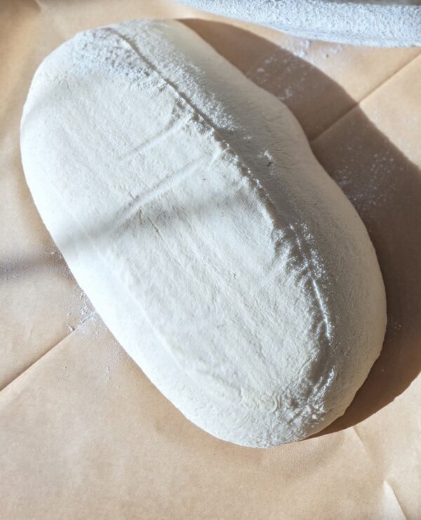 Gently fold and pinch the dough into the desired size and shape, pinching a seam to hold the dough together. Place the dough — seam side up — into a floured tea-towel-covered banneton, or bowl, or Tupperware. Cover with plastic. Place the container(s) in the refrigerator and let rest for 12 to 15 hours. (Or, you can let it rise at room temperature for 3 to 4 hours.)