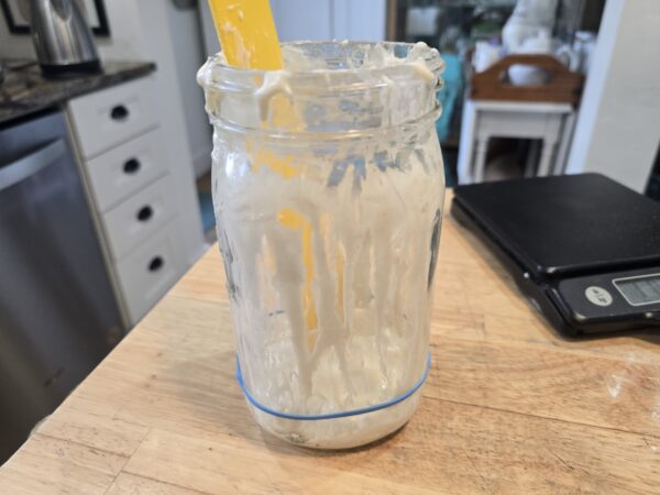 This jar of active starter sits patiently on Doni’s counter where it will soon triple in size.