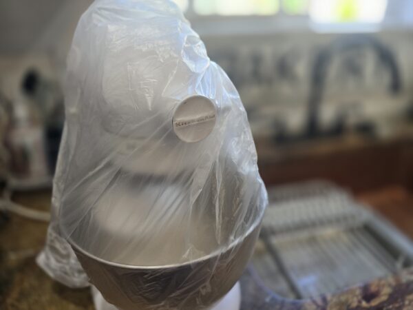 The KitchenAid hangs out with a bag on its head as it rests for 30 minutes. Fun fact, this mixer once belonged to the lovely Peggy Lewis, mother of intrepid reporter Jon Lewis.