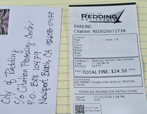 Meanwhile, in the same lot where I received my ticket, City of Redding parking enforcement officer Mason Baarts perused the lot looking for non-paying offenders. A former Redding Police cadet, he’s worked in this position since September of 2025, and said that on average he writes about 40 parking citations a day.
