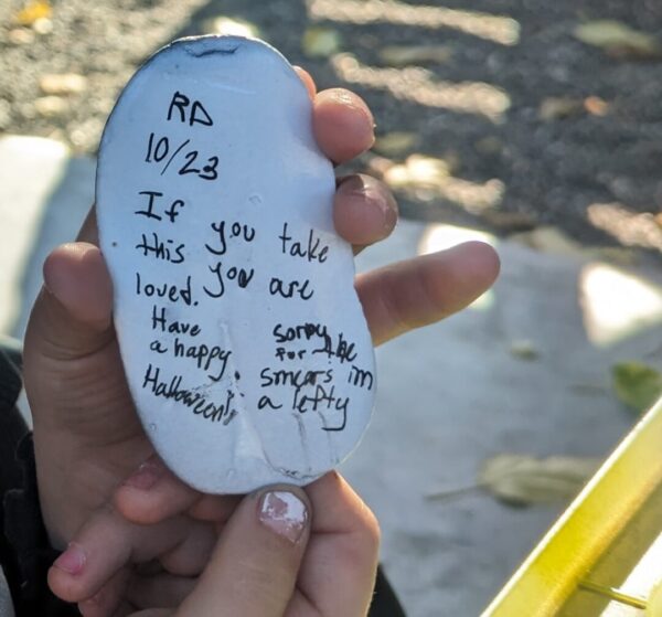 I take my job as the Little Free Library caretaker very seriously. Job No. 1 is I make sure the library is always stocked with books. At Christmas time I placed miniature cellophane wrapped candy canes inside a pretty jar. My granddaughter left inside the library and at its base her hand-painted rocks with sweet messages like, “10/23 If you take this you are loved. Have a happy Halloween. Sorry for the smears I’m a lefty.”