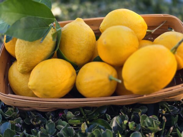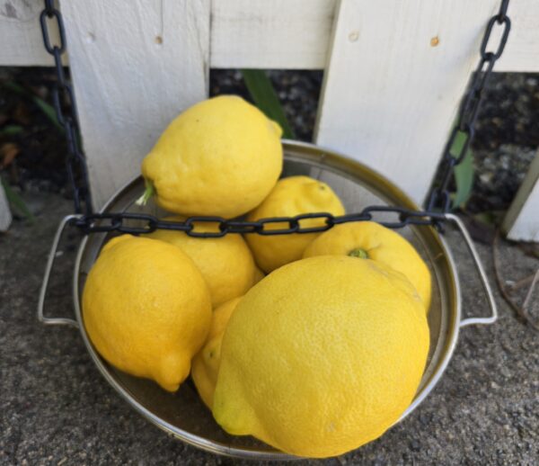 In springtime, I placed a pretty basket on the wall beside the library and filled it with lemons, a bounty from my prolific Myer and Lisbon lemon trees.