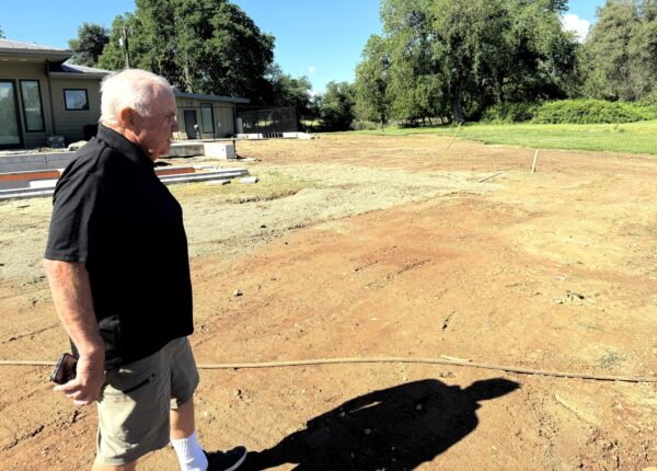Mike Michalak, owner of The Fly Shop and resident of the River Ranch neighborhood, stands next to a neighbor’s pool house and swimming pool that’s being built next to a county-proposed Alternative Custody Campus near the Sacramento River in south Redding. Photo by Mike Chapman for A News Cafe.