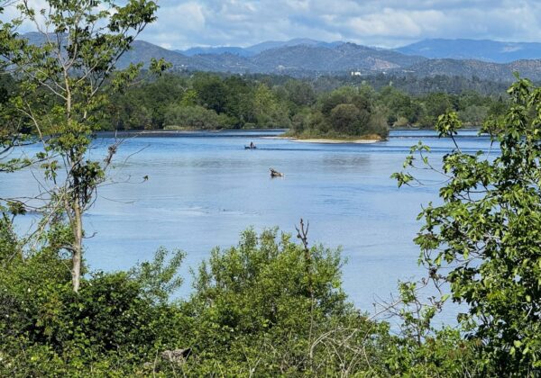 A drift-boat fisherman in the distance travels the Sacramento River where just past the left bank the county wants to build an Alternative Custody Campus and possible jail in south Redding. Photo by Mike Chapman for A News Cafe