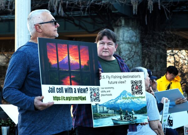 River Ranch neighborhood residents David Duke, left, and Katrina Baumann protest Shasta County’s proposed Alternative Custody Campus and possible future jail site before the start of the Redding Planning Commission meeting on Jan. 13, 2026. Photo by Mike Chapman for A News Cafe.